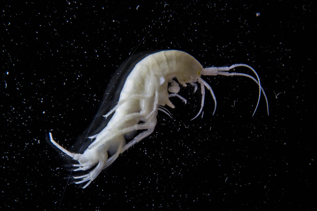 Niphargus puteanus originaire de la région de Schaffhouse. Comme cette espèce vit dans des habitats souterrains, elle est dépourvue des yeux et de pigmentation.